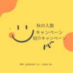 - 🍁秋の入塾キャンペーン🍁いつも当ブログをお読みいただき、ありがとうございます。 徐々に秋の気配が感じられる今日この頃、秋の入塾キャンペーンとお友達紹介キャンペーンをスタートします! 後期中間の結果を見て、「得意を伸ばす」「苦… 続きを読む: 🍁秋の入塾キャンペーン🍁