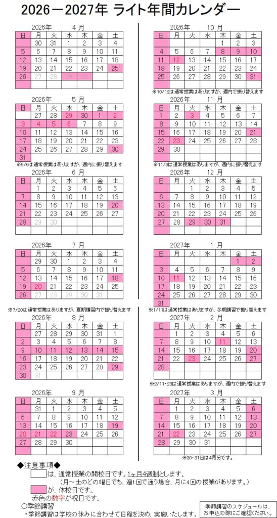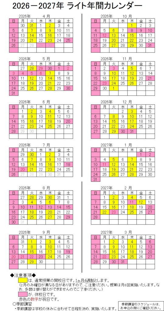 【塾生の皆様】🌸ライト年間スケジュール🌸